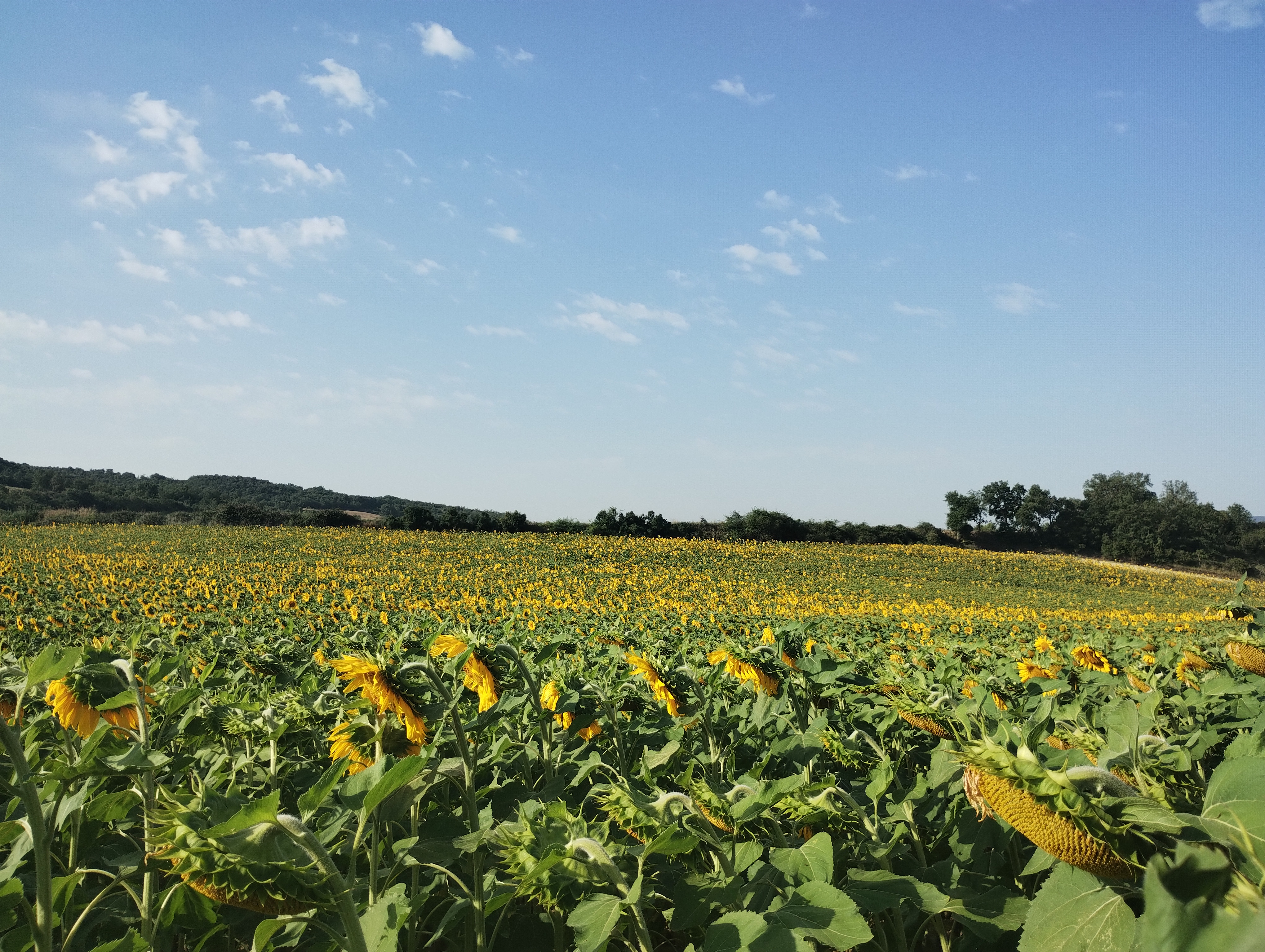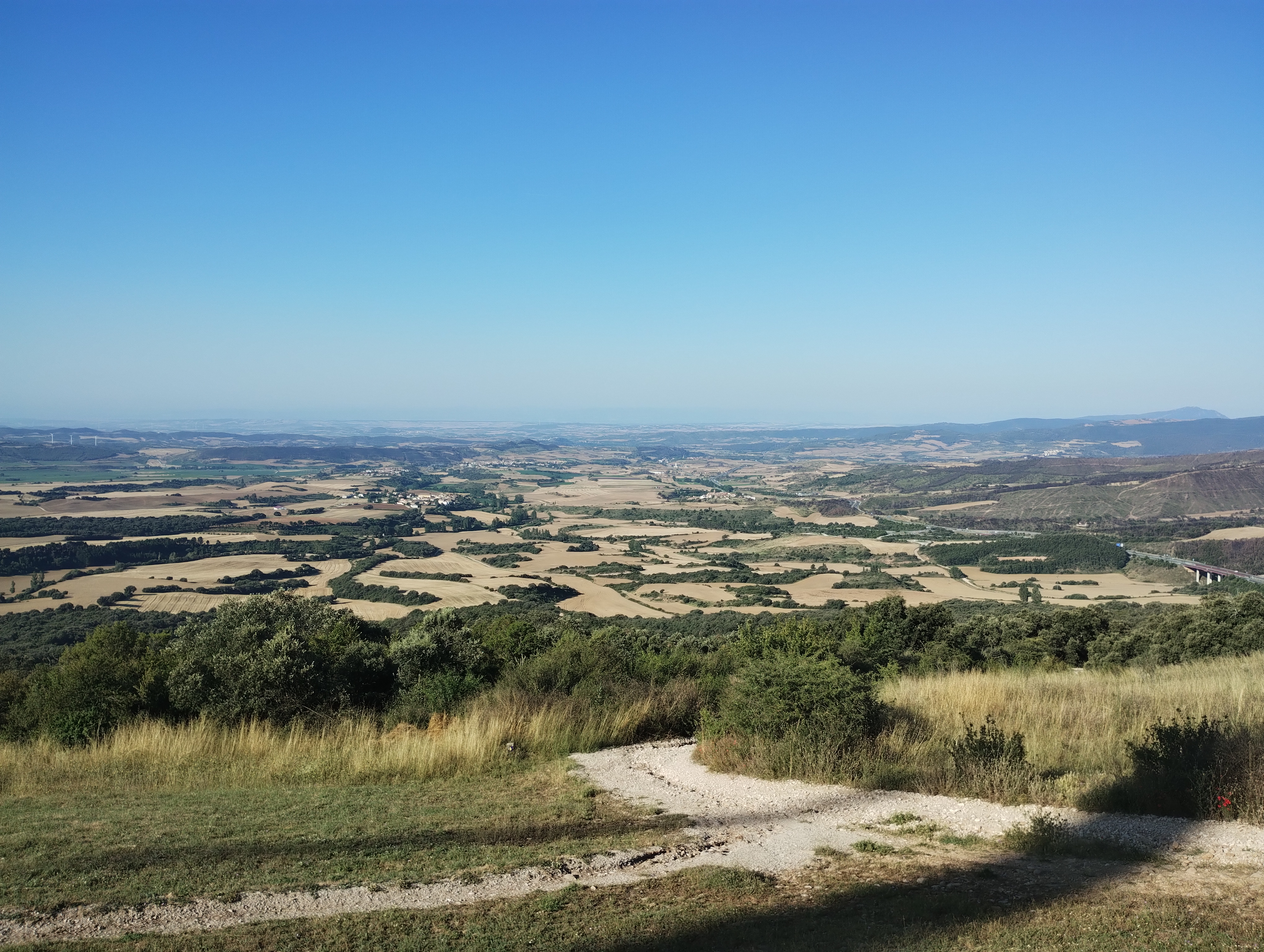 Una leggera salita attraverso campi di grano e di girasole mi ha portato sino allo scavallamento dell’Alto del Perdon da cui ho potuto ammirare da una parte Pamplona ed i Pirenei e dall’altra la sterminata pianura della Navarra verso la quale mi sto dirigendo.