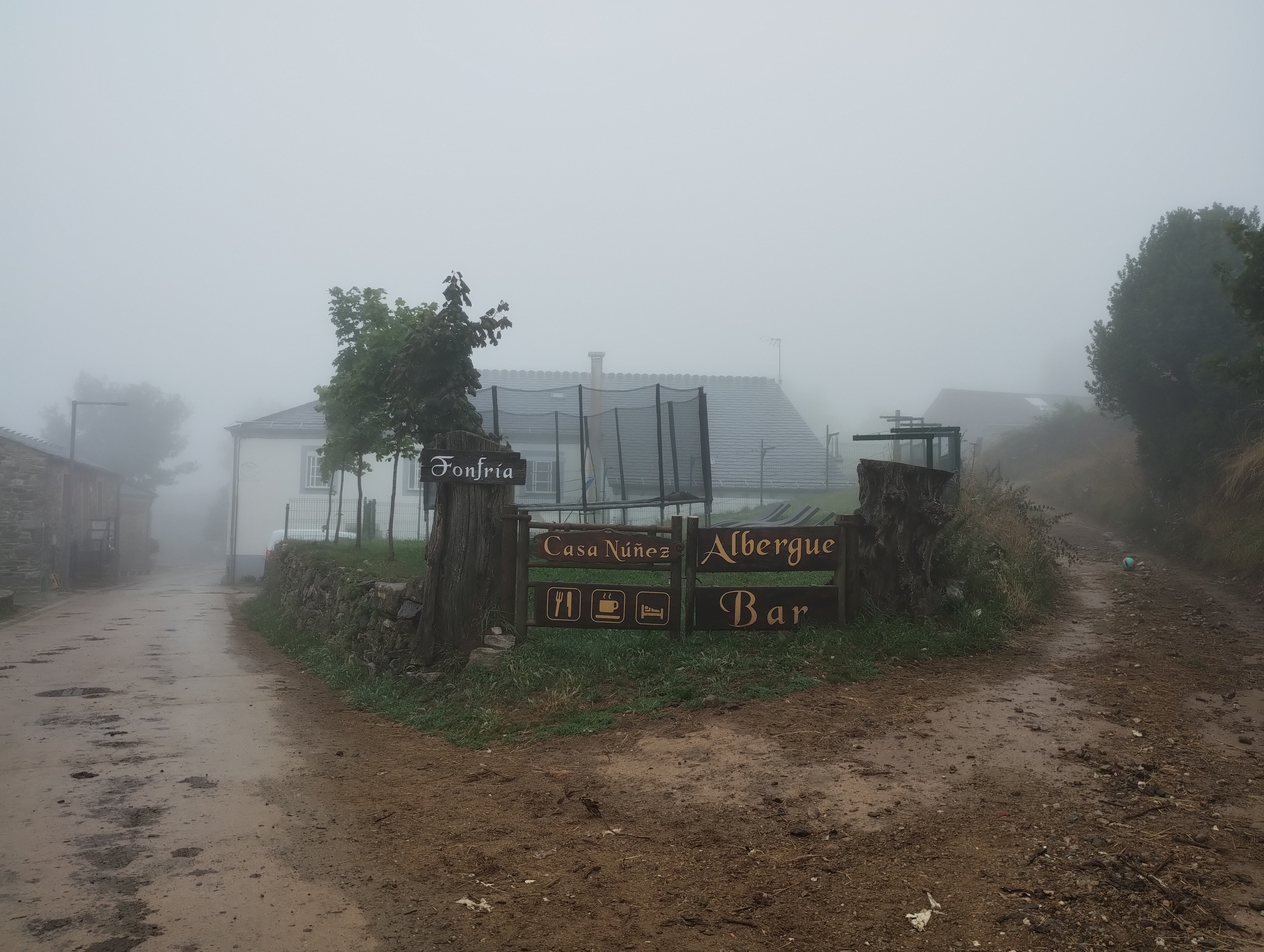 Inevitabilmente la discesa ci ha portati all’interno del banco di nubi sino a raggiungere il paese sottostante di El Acebo completamente immerso nella nebbia.